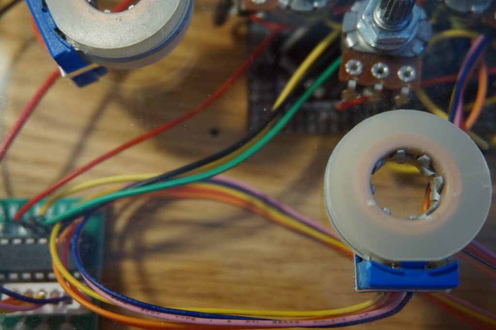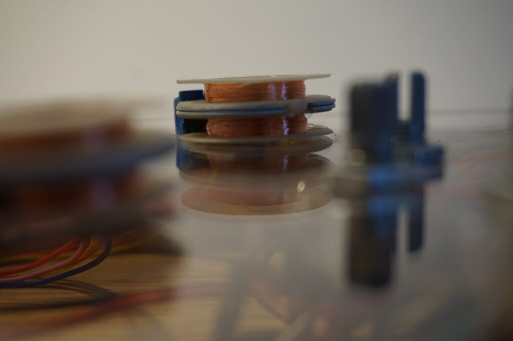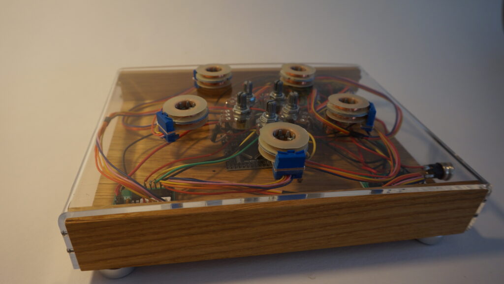 This is the first synth I’ve ever developed. It’s basically a controllable EMF emitter. It’s built from five ULN2003A boards and five corresponding steppers, from which I removed the metal casing and all the mechanical parts, leaving only the coils emitting a pulse wave. Each emitter has a pot that determines the speed of the pulse wave. The amplitude is controlled by the distance to the antenna. This adds a very nice amount of possible expression to the instrument.